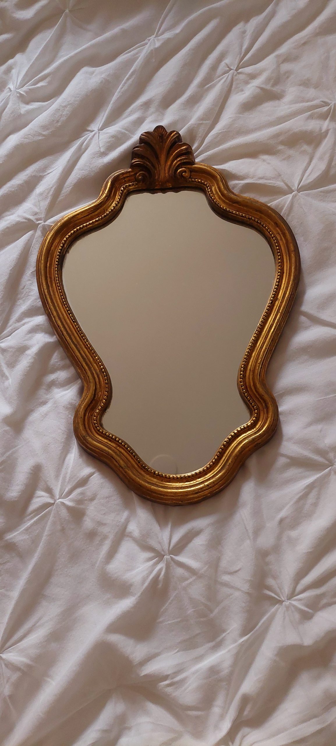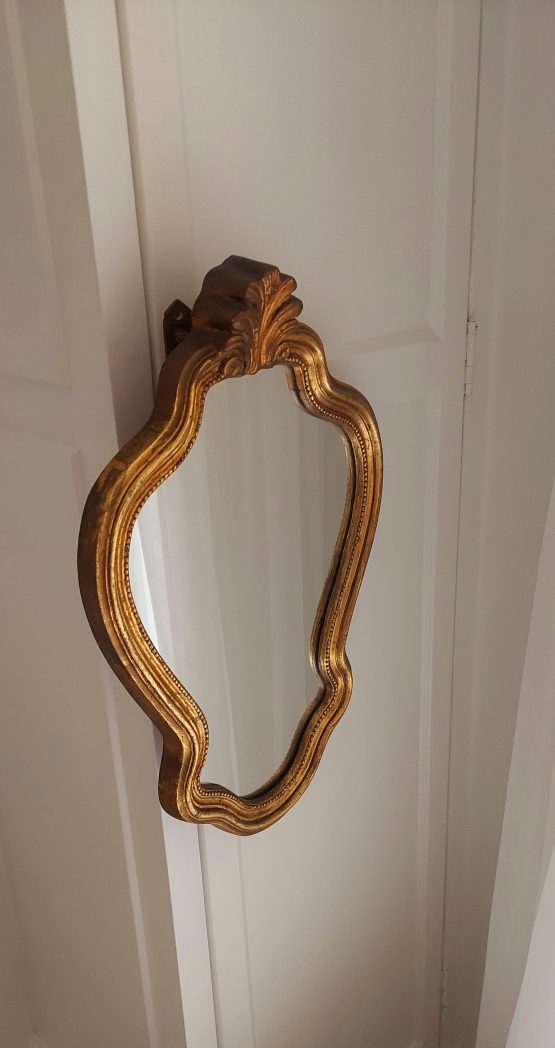 Deze vintage kuifspiegel is een fijne eyecatcher in je interieur. Goud is tijdloos mooi en toch weer helemaal van nu! De spiegel heeft een subtiele kuif en heeft mooie organische rondingen. Het glas is nog heel erg mooi.