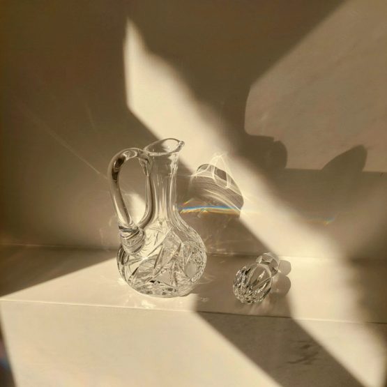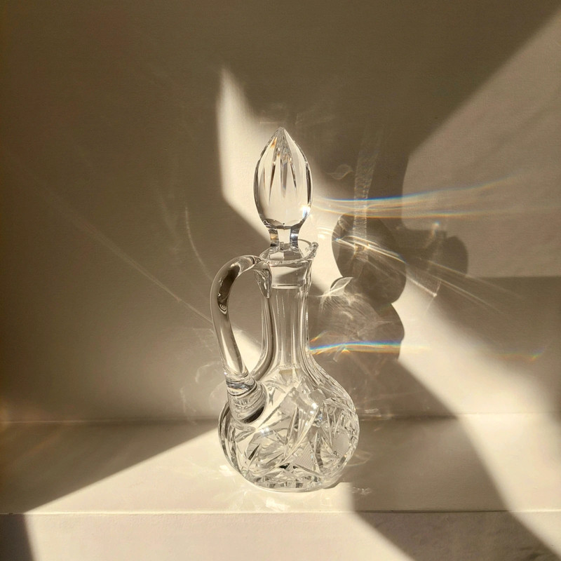 Prachtig sierlijk karafje van Tsjechisch mondgeblazen kristalglas. Het karafje is heel subtiel en is eenvoudig ergens bij te zetten. Het geeft een prachtig regenboogeffect wanneer de zon erop schijnt.